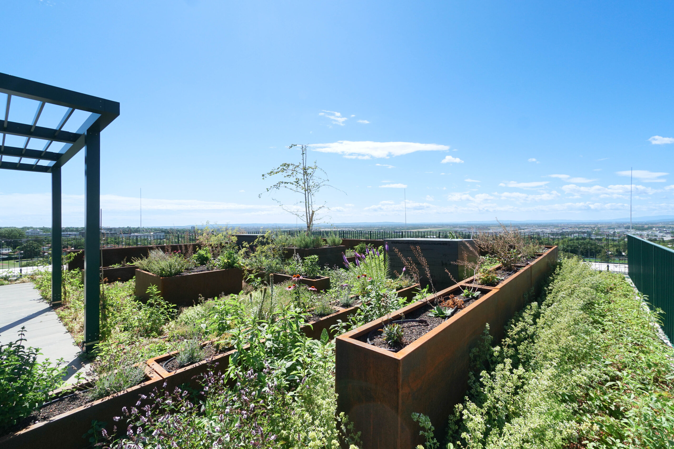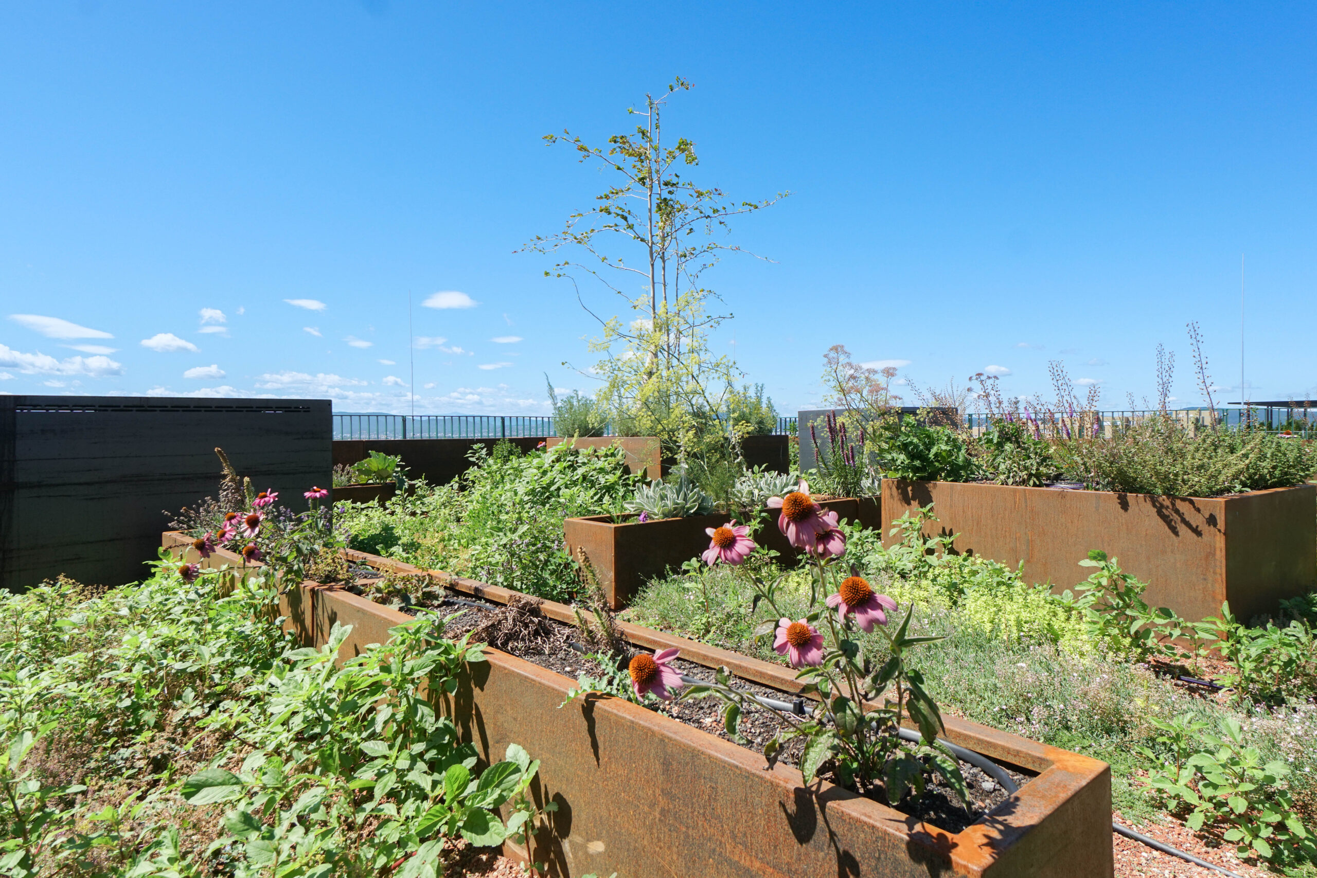 An der Fassade rankt sich üppiges Grün über die insgesamt sieben Geschosse bis zum Dach, auf dem als Abschluss ein Kräutergarten nach Hildegard von Bingen auf die Bewohner wartet. Leuchtbänder an der Fassade, gemeinsam mit indirekter Beleuchtung an der Unterseite der Balkone, sorgen für magische Lichtstimmungen. Im Aufzug begeistert eine grüne Mooswand hinter Glas.
