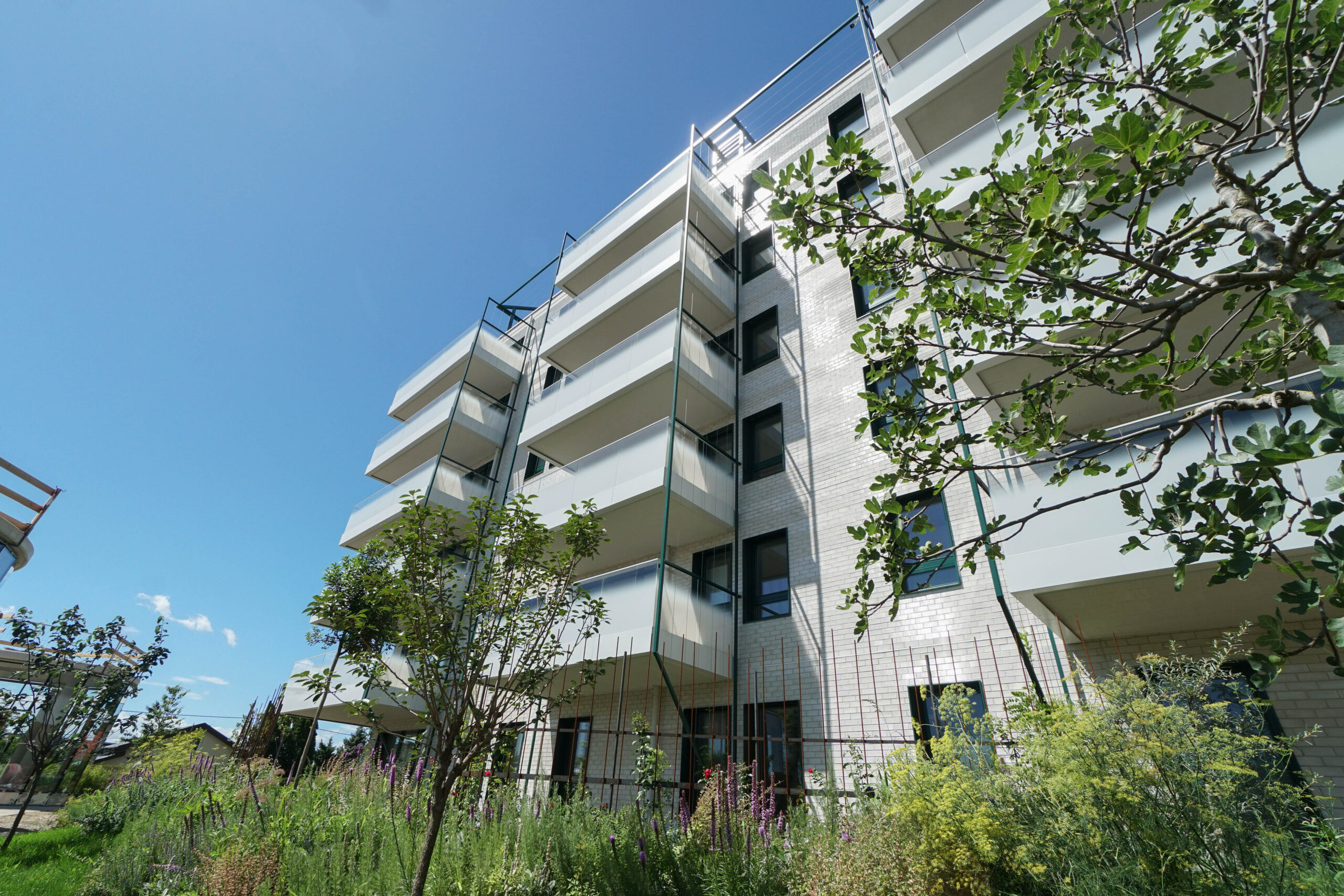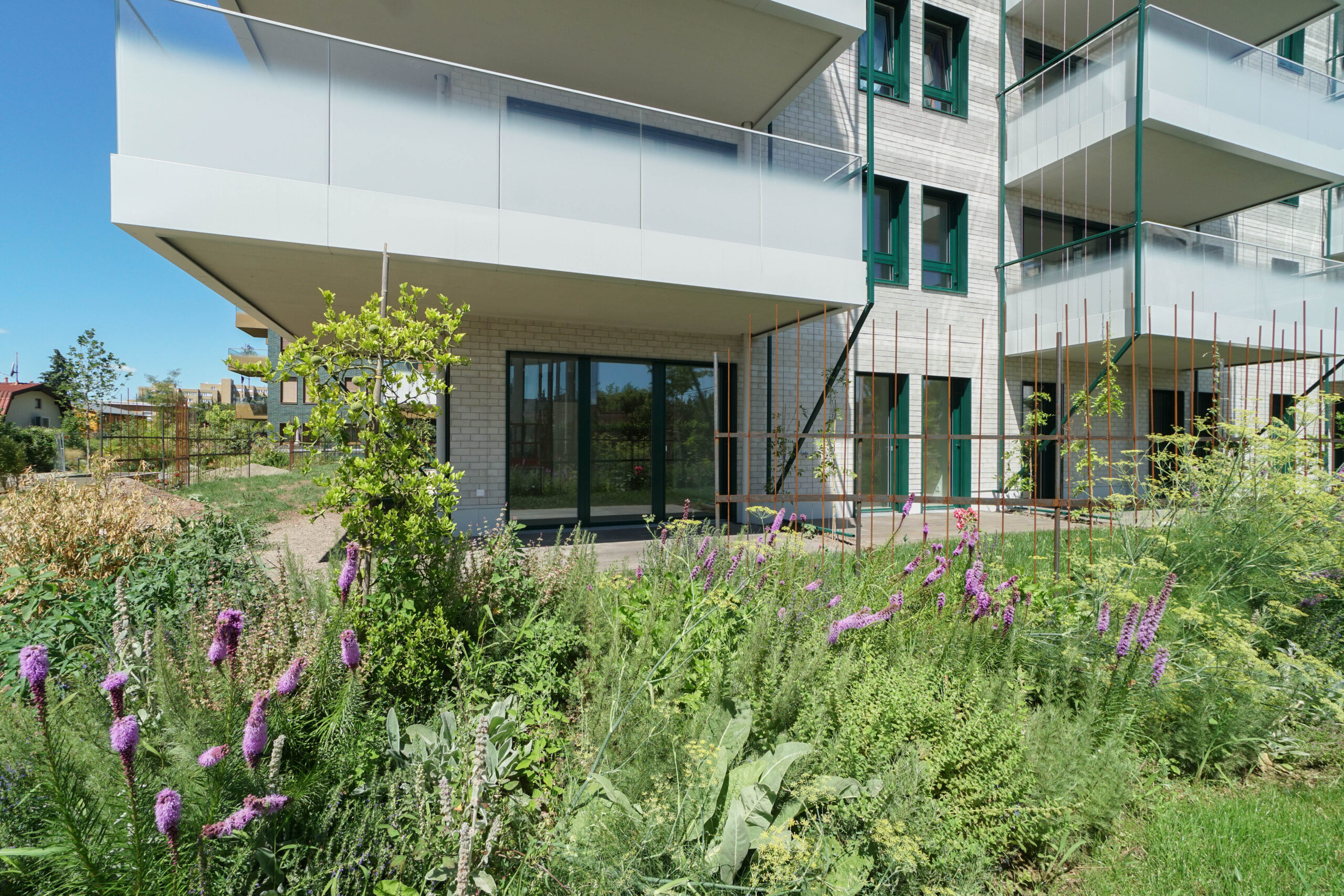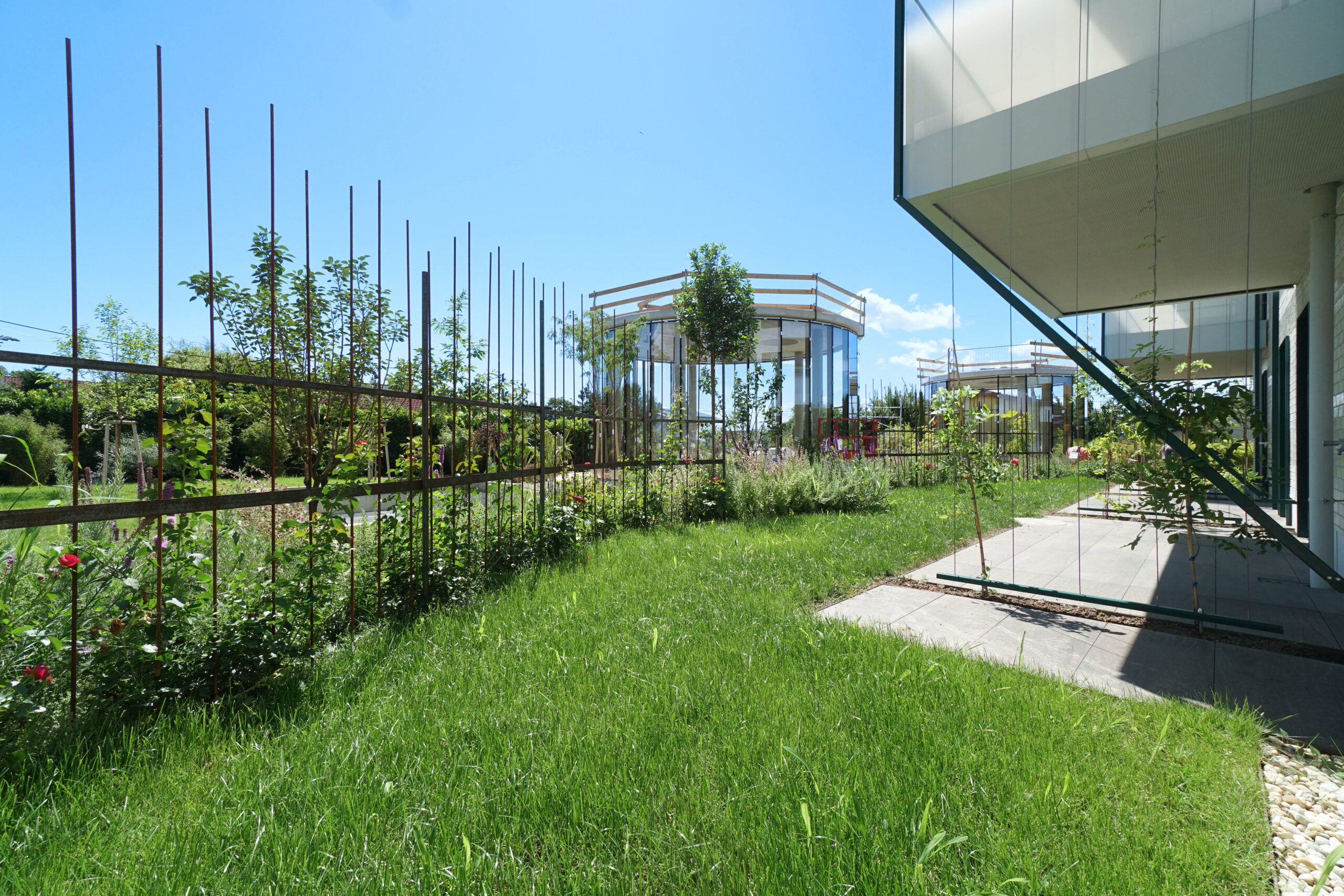 Eingebettet in die künstlerische Gartengestaltung von André Heller bieten die neuen Wohnungen einen großzügigen Blick in die weite Landschaft über die benachbarte Kleingartensiedlung. Das lebendige Farbenspiel der diversen Mosaikböden bei den Glashäusern und die mediterrane Bepflanzung im marokkanischen Garten schaffen eine harmonische Verbindung zwischen Architektur und Natur. Eine Allee aus Bambus bildet entlang der südlichen Grenze einen malerischen grünen Abschluss und eine geschützte Ruhezone für die Bewohner.